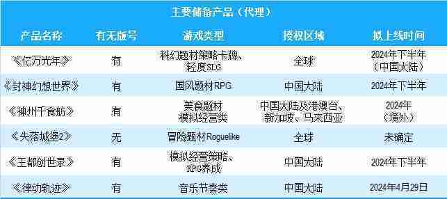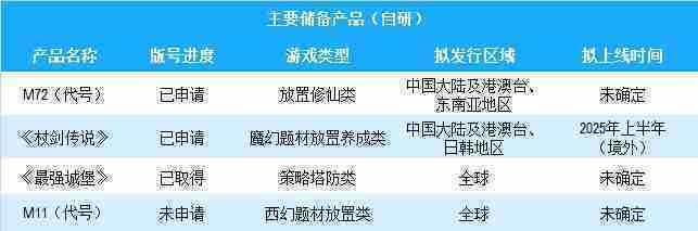 公司有多款储备产品,,涵盖放置类、、、、策略类、、、、RPG、、、Roguelike等多元化游戏品类,,,,储备的主要自研和代理产品如下:::